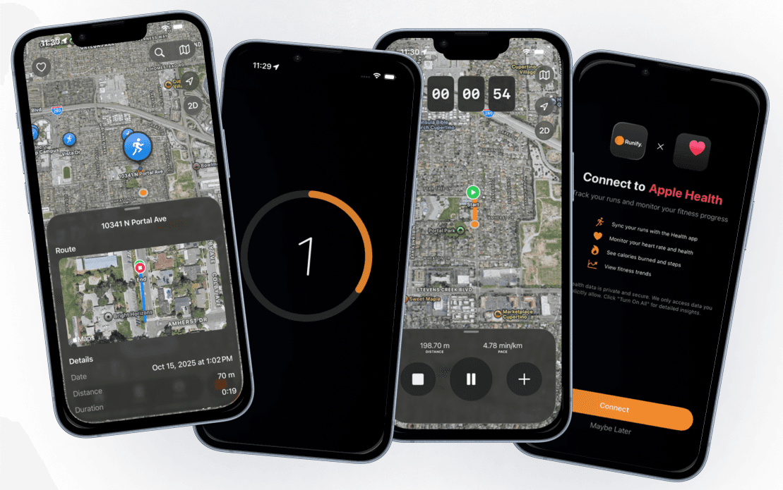 Runify features a modern SwiftUI interface with smooth animations, dark mode support, and intuitive navigation. Every run is automatically named based on your starting location, and you can favorite your best runs for quick access. Built entirely with native iOS technologies for the best performance and privacy.